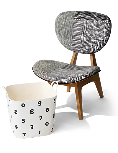 座り心地の良さを追求した[Coccole / コッコレ]や天童木工などとのコラボレートアイテム。テキスタイルがお部屋のアクセントに。