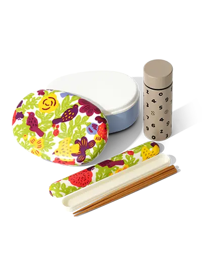 京型友禅で染めた生地の質感がそのまま楽しめるお弁当箱と箸箱、テキスタイルデザインが楽しいタンブラーなど。ピクニックや通勤通学が楽しくなるアイテム