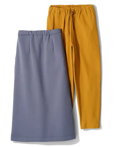 軽くて動きやすい、天然素材の「高島縮」。流行に問わられないベーシックなデザインのズボンやスカート。