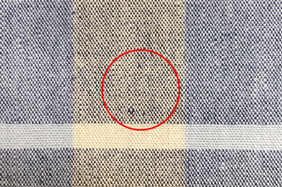 7) 生地不良がある場合、写真のようにピンで印をし、1ヶ所につき+20cmの長さでカットいたします。