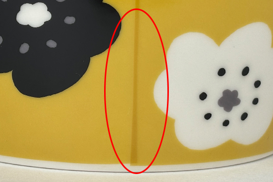 ・磁器製品は、釉薬と呼ばれる上薬を施しています。釉薬の流れや溜まりで濃淡が表面に現れたり、気泡や黒い点が現れたりすることがありますが、磁器の特性です。