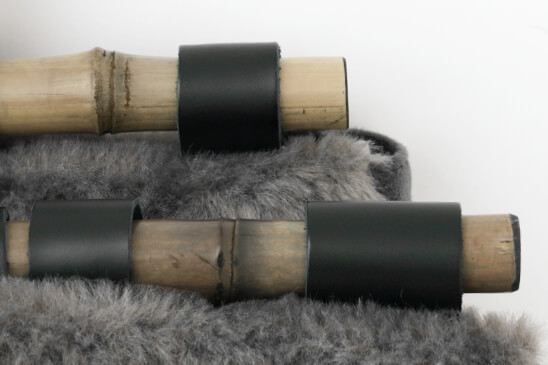 ・本体はフェイクファーとフェイクスエード生地、持ち手には竹又謹製の竹と牛革を使用しております。